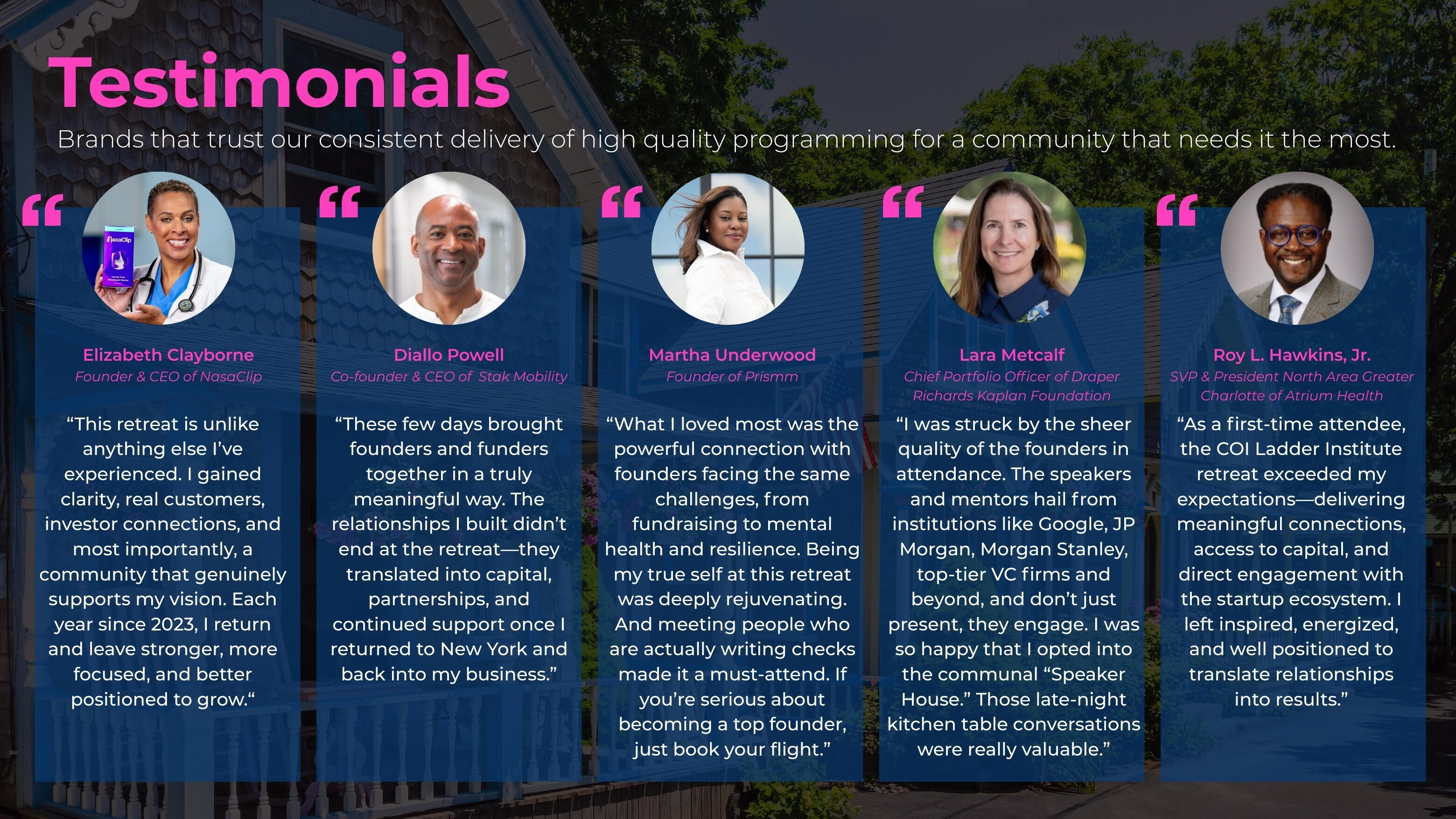 COI Ladder Institute is thrilled to present its 13th annual Unleashing Retreat for founders, funders, and ecosystem builders who are prepared to drive their businesses forward by fostering impactful connections within a supportive community.This year’s Unleashing the Power of Human Intelligence Retreat is centered on cultivating meaningful relationships to drive personal and business success during turbulent times. This retreat is creating a space that enables participants to develop deep, lasting connections.This gathering offers actionable strategies from the most influential founders, investors, accelerators, and strategic partners to advance and transform businesses through the power of connections.Central to all activities hosted at the retreat is Founder Therapy. The founder's physical, mental, and spiritual health are thoughtfully woven into the agenda. Founders will leave the retreat equipped with strategies and tools to solve BIG problems that are sustained by profound connections, checks and contracts (The 3 C's). Join us!