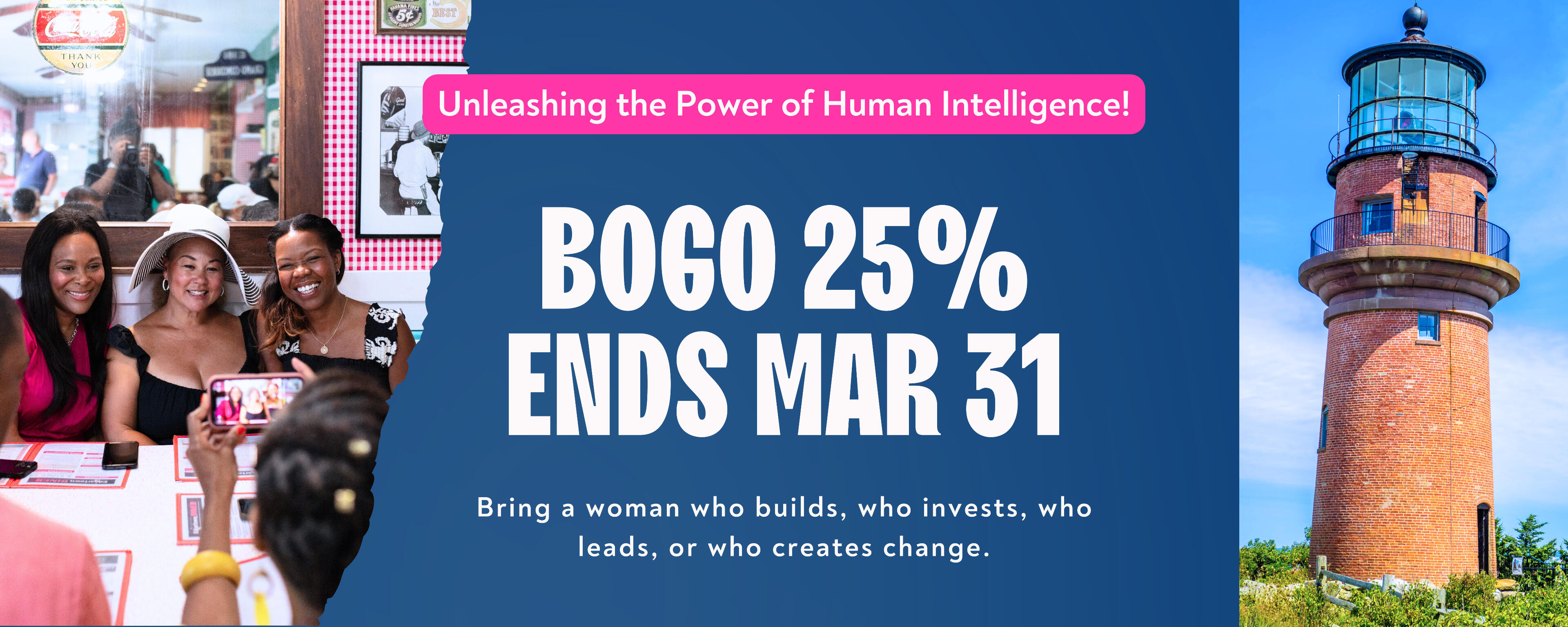 STRONG WOMEN RISE, SHINE AND INSPIRE ON THE VINEYARD!This year, you don’t have to come alone. Bring a woman who builds, who invests, who leads or who creates change.This is where women gather with intention, sharpen ideas through real dialogue, and turn shared presence into shared power.Because powerful rooms are even more powerful when shared, we are offering a limited-time Buy One, Get One 25% OFF experience. Use code “BOGO25” to receive a discount.Martha’s Vineyard | August 3-5, 2026